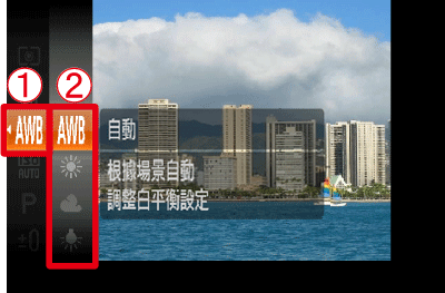 )。 - 下面示例介紹當 [白平衡] 處於預設值時,如何設定 [白平衡]。