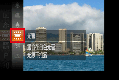 左右按 <方向按鈕> 選擇您要更改為的 [白平衡] 模式。(本例中選擇的是 [光管]。(