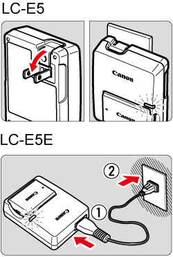 如箭頭所示,開啟電池充電器插頭並將插頭插入電源插座。