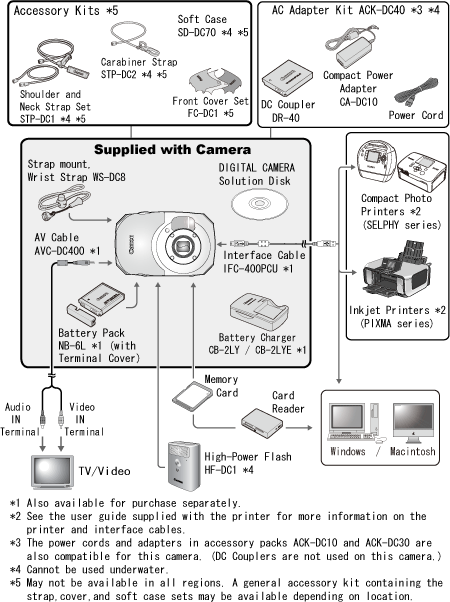 - 建議使用佳能原裝配件。使用佳能原裝配件時,該產品可達到最佳性能。佳能對非原裝佳能配件的故障 (如電池洩漏與/或電池爆炸) 而導致本產品的損壞與/或意外,如火災等,不承擔任何責任。請注意,此保證不適用於非原裝佳能配件的故障,但是您可以請求付費維修。