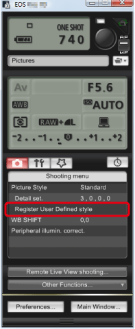 9. 在[相片風格(Picture Style)]視窗中,按一下您已變更設定的相片風格。變更的設定會應用於相機,然後[拍攝選單(Shooting menu)]會出現。