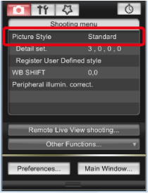 8. 在再次出現的[拍攝選單(Shooting menu)]視窗中,按一下[相片風格(Picture Style)]。