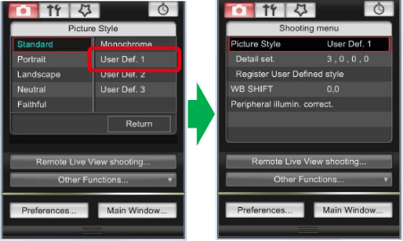 您可以確認使用「EOS Utility」註冊的相片風格檔案已應用於[使用者定義 1]。