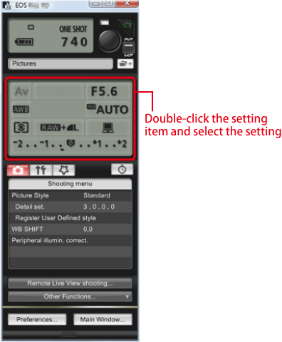 要執行此設定,按一下 EOS Utility 主視窗的[偏好設定(Preferences)] 顯示[偏好設定(Preferences)] 對話方塊,按一下<遙控拍攝(Remote Shooting)>設定頁,在出現的視窗中,選擇[也儲存至相機的記憶卡上(Save also on the camera's memory card)]核選方塊。