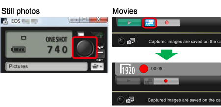 靜止影像︰按一下相機釋放按鈕拍攝。所拍攝影像會傳輸至電腦,「Digital Photo Professional」自動啟動,顯示拍攝的影像。