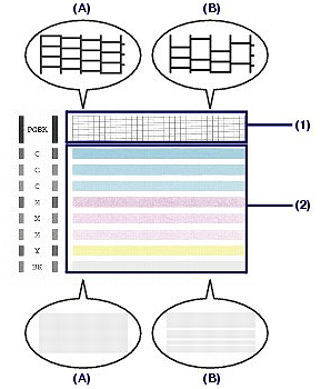 1. 檢查圖案(1)中是否有線條缺失或圖案(2)中是否有白色條紋。