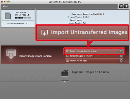 ),按一下[匯入(Import)] > [資料夾設定(Folder Settings)],然後按一下[瀏覽(Browse)]變更此設定。5. 出現以下視窗,按一下[匯入未傳輸的影像(Import Untransferred Images)]。
