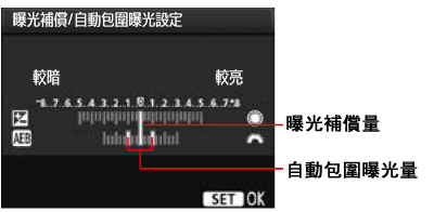 您可以使用<速控轉盤>設定曝光補償量。如果 AEB 與曝光補償一起使用,將根據曝光補償量應用 AEB。