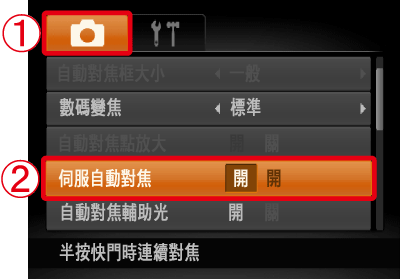 按 <方向按鈕> 將 [伺服自動對焦] 設定為 [開]。完成這些設定後,按下 <MENU> (