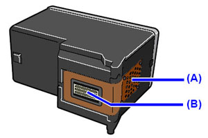 - 請勿接觸墨盒上的電氣觸點(A)或列印頭噴嘴 (B)。如果觸摸,印表機可能無法正常列印。