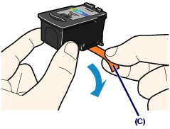 (1) 從包裝中取出新墨盒(FINE Cartridge )並輕輕撕下橙色保護膠帶 (C)。