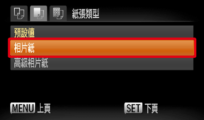 上下按 <方向按鈕> 選擇紙張類型,然後按相機的 <FUNC./SET> (