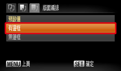 上下按 <方向按鈕> 選擇編排類型,然後按相機的 <FUNC./SET> (