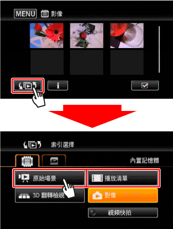 * 從 [播放清單] 索引螢幕 (包括視頻快拍場景的播放清單) 複製場景時,無法逐一選擇場景,而將複製整個播放清單。直接跳轉至步驟 5。