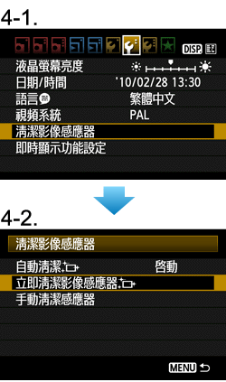 4-2. 按<十字鍵>從出現的選單中選擇[立即清潔影像感應器],然後再次按<SET>按鈕。