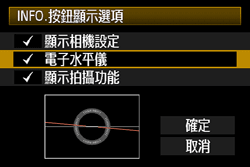 ],然後選擇 [INFO.按鈕顯示選項],最後在液晶螢幕上出現的視窗中選擇 [電子水平儀]。