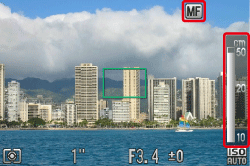 ) 和 [手動對焦指示器]。如果將對焦集中於主體的明暗對比區域並半按 <快門按鈕> 或反復半按 <快門按鈕>,[自動對焦框] 將會出現且相機將會對焦。