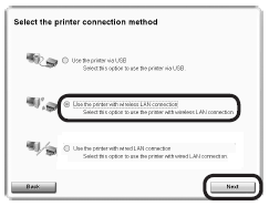 選擇「透過無線 LAN 連接使用印表機 (Use the printer with wireless LAN connection)」,然後按一下「下一步 (Next)」。