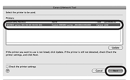 在 Canon IJ Network Tool 螢幕上的「印表機 (Printers)」中選擇「MX xxx series」,然後按一下「下一步 (Next)」。