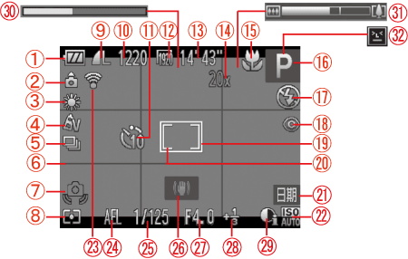 ![]() | 相機抖動警告 | ![]() | Eye-Fi 連接 狀態 |