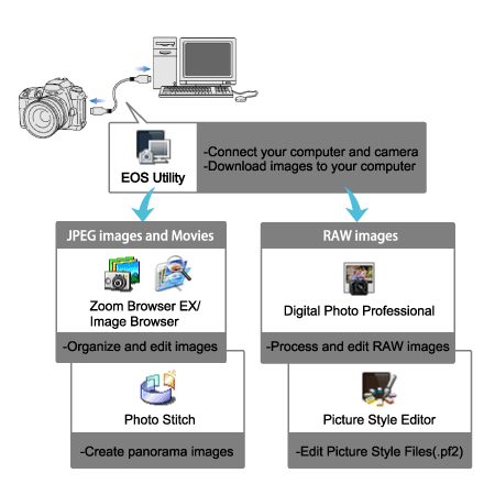 | EOS Utility | 此軟件能連接電腦和相機以將相機拍攝的影像(靜止影像/短片)下載到電腦上,進行相機的各種設定以及使用電腦遙控拍攝。 *佳能提供五首原始背景音樂曲目。使用EOS Utility複製背景音樂曲目至記憶卡,可在使用相機播放短片隨拍相簿、短片及幻燈片時播放背景音樂。 |