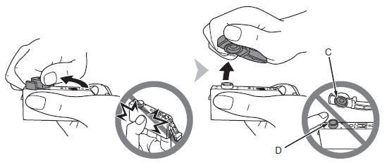 請勿觸摸橙色保護蓋內側(C)或開啟墨水連接埠(D)。否則可能弄髒雙手。
