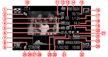 ![]() | 顯示的影像 編號/影像 總數 | ![]() | 拍攝日期及時間 |