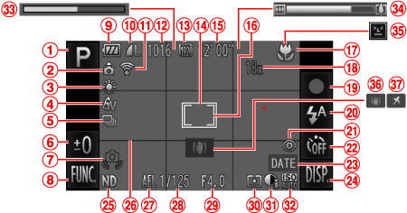 ![]() | 記錄像素、MOV (短片) | ![]() | DISP.(顯示) |