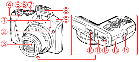 ![]() | 變焦桿 拍攝: (遠攝)/ (廣角)播放︰ (放大)/ (索引) | ![]() | 記憶卡/電池蓋 |