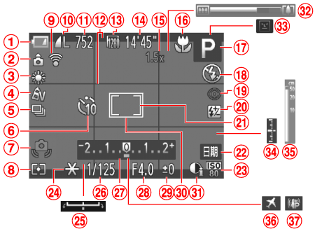 ![]() | 對焦範圍、自動對焦鎖、影像穩定器模式圖示 | ![]() | 手動對焦指示器 |