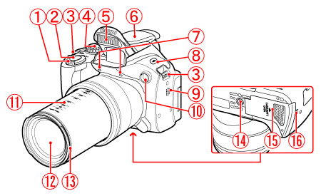 ![]() | (閃光燈) 按鈕 | ![]() | 直流電連接器連接線連接埠 |