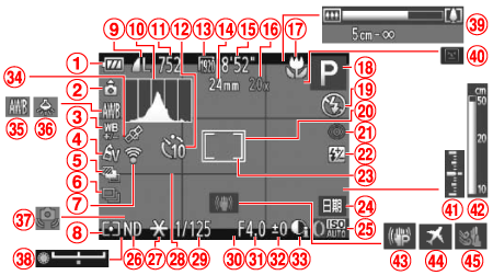 ![]() | 拍攝模式、場景圖示 | ![]() | 曝光等級 |