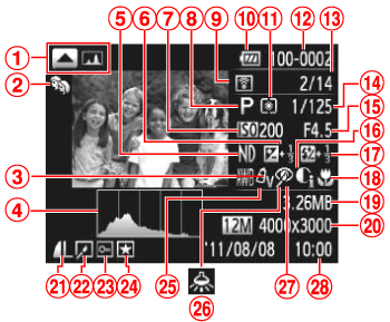 ![]() | 顯示的影像編號/影像總數 | ![]() | 白平衡補償/紅眼修正 |
