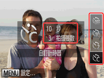 > 按鈕設定 [啟動延遲] 和 [拍攝張數]。請注意,相機處於以下模式時,可用的自拍功能會受限。