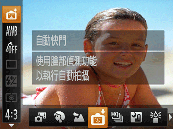 ( ) | 將相機對準人物並完全按下快門按鈕。相機將在偵測到眨眼後約兩秒時拍攝。 | - 減慢眨眼的速度。 - 如果頭髮或帽子蓋住眼睛或戴有眼鏡時,相機可能無法偵測到眨眼。 - 閉上雙眼亦會被偵測為眨眼。 - 如果未偵測到眨眼,約 15 秒後相機將自動進行拍攝。 - 如果完全按下快門按鈕時沒有拍攝到人物,相機將在人物進入拍攝範圍並眨眼後進行拍攝。 |