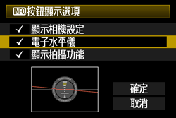 您可以使用相同的步驟,在即時顯示拍攝時及拍攝短片前顯示電子水平儀。