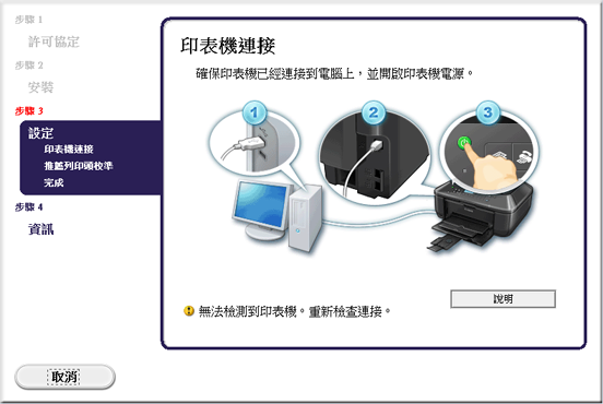 若無法越過「印表機連接」螢幕繼續操作,請確認 USB 電纜線已穩固插入本機的 USB 連接埠和電腦中,然後按以下步驟重新安裝 MP Drivers。