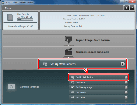 為您要使用的網路服務調整帳戶設定。因為 CameraWindow 用來調整設定,所以請務必事先從隨附的 CD-ROM 中安裝 CameraWindow。