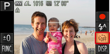 - 觸控螢幕上顯示的人臉以選擇眨眼的人物 (觸控自動對焦)。 確認將要眨眼的人物臉部週圍出現一個綠色框。 - 減慢眨眼的速度。 - 如果頭髮或帽子蓋住眼睛或戴有眼鏡時,相機可能無法偵測到眨眼。 - 閉上雙眼亦會被偵測為眨眼。 - 如果未偵測到眨眼,快門也將在約 15 秒後釋放。 - 如果完全按下快門按鈕時沒有拍攝到人物,相機將在人物進入拍攝範圍並眨眼後進行拍攝。 |
