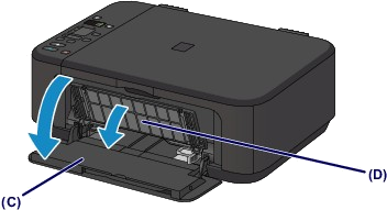 1. 請確認電源已開啟,開啟前蓋 (C),然後開啟出紙托盤 (D)。