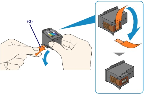 (1) 從包裝中取出新的 FINE 墨盒並輕輕撕下保護膠帶 (G)。