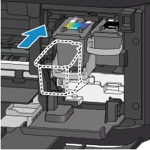 (1) 將新 FINE 墨盒平直地完全插入 FINE 墨盒固定座直至其觸到固定座後部。