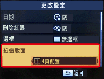 4. 出現下方螢幕。選擇螢幕上的 [紙張版面] 設定。(此處選擇了 [4頁配置]。 )