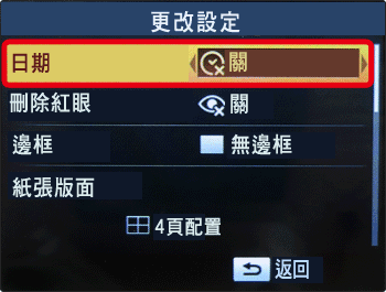 4. 出現下方螢幕。您可以在螢幕中設定 [日期] 或 [邊框]。完成設定後按 <BACK> (