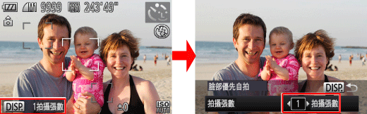 > 按鈕後,如要變更拍攝張數,可以左右按 <方向按鈕> 選擇拍攝張數,然後再次按下 <