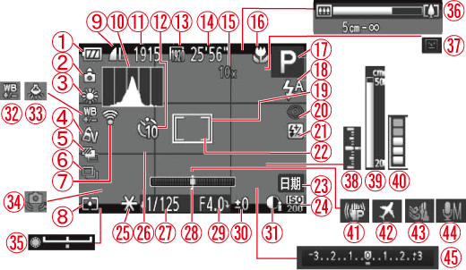 ![]() | 對焦範圍、自動對焦鎖、影像穩定器模式圖示 | ![]() | 手動對焦指示 |
