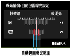 按下 <多功能控制器> 以設定曝光補償量。如果 AEB 與曝光補償一起使用,AEB 會將曝光補償量作為中間值應用。