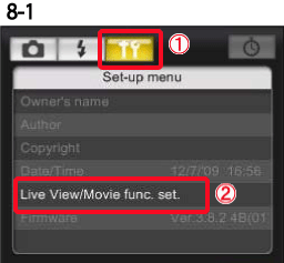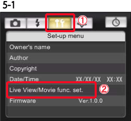 顯示 [設定選單 (Set-up menu)],然後按一下 [即時顯示/短片功能設定 (Live View/Movie func. set.)] (