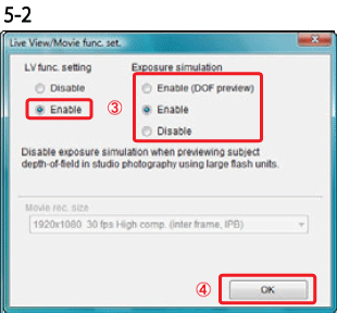 5-2. 出現 [即時顯示/短片功能設定 (Live View/Movie func. set.)] 視窗,在 [即時顯示功能設定 (LV func. setting)] 下選擇 [啟動 (Enable)] (
