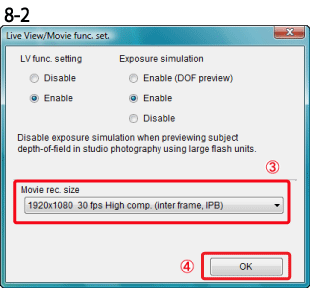 8-2. 出現 [即時顯示/短片功能設定 (Live View/Movie func. set.)] 視窗,從清單方塊 (